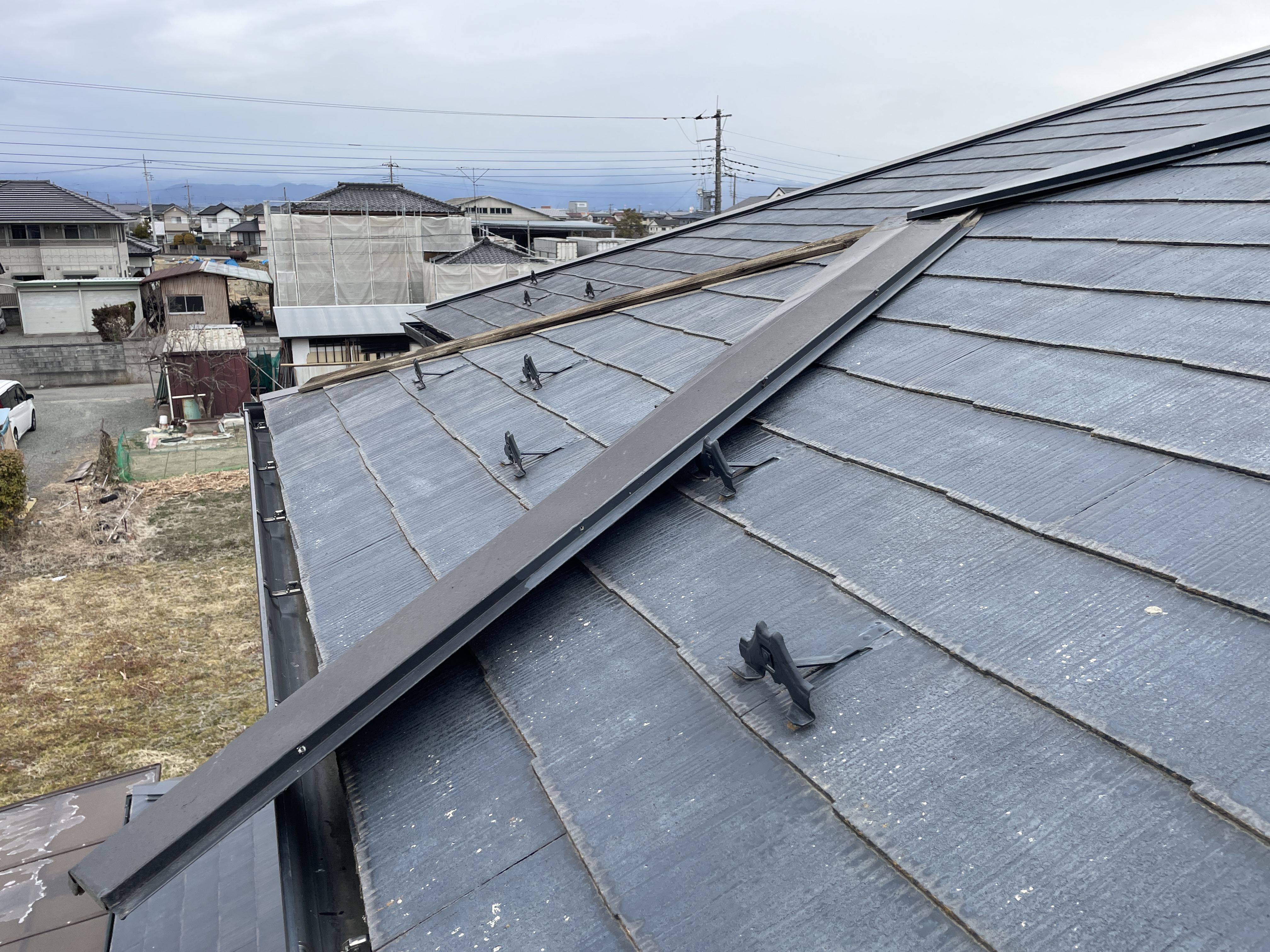 屋根についている棟の板金役物が外れています。